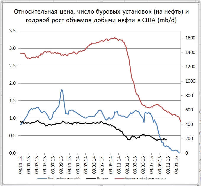 От зафиксированного в конце лета локального максимума количества буровых на нефть к текущему моменту снижение составило уже 35%. Можно смело говорить об устойчивой тенденции. Теперь необходимо дождаться связанного с общим количеством скважин снижения объемов добываемой нефти. Скорей всего активное снижение добычи нефти будет проявляться с начала весны и это будет важным фактором воздействия на цены.