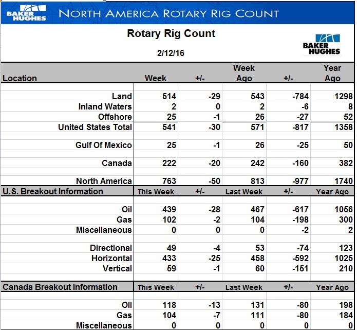 Вышла свежая порция данных от компании Baker Hughes на 12 февраля. В Канаде наблюдалось весьма заметное снижение числа действующих буровых установок на нефть – минус 13 штук или чуть менее -10% (и на газ минус 7 шт). В США тоже вновь активно снизились буровые на нефть (-28 шт.) Очередные минус 6% за неделю. Таким образом, всего от максимума осталось только 27,3% действующих буровых. Как видим, в США за новым витком снижения цен на нефть с полугодовым запозданием пошла вторая волна сворачивания числа буровых.