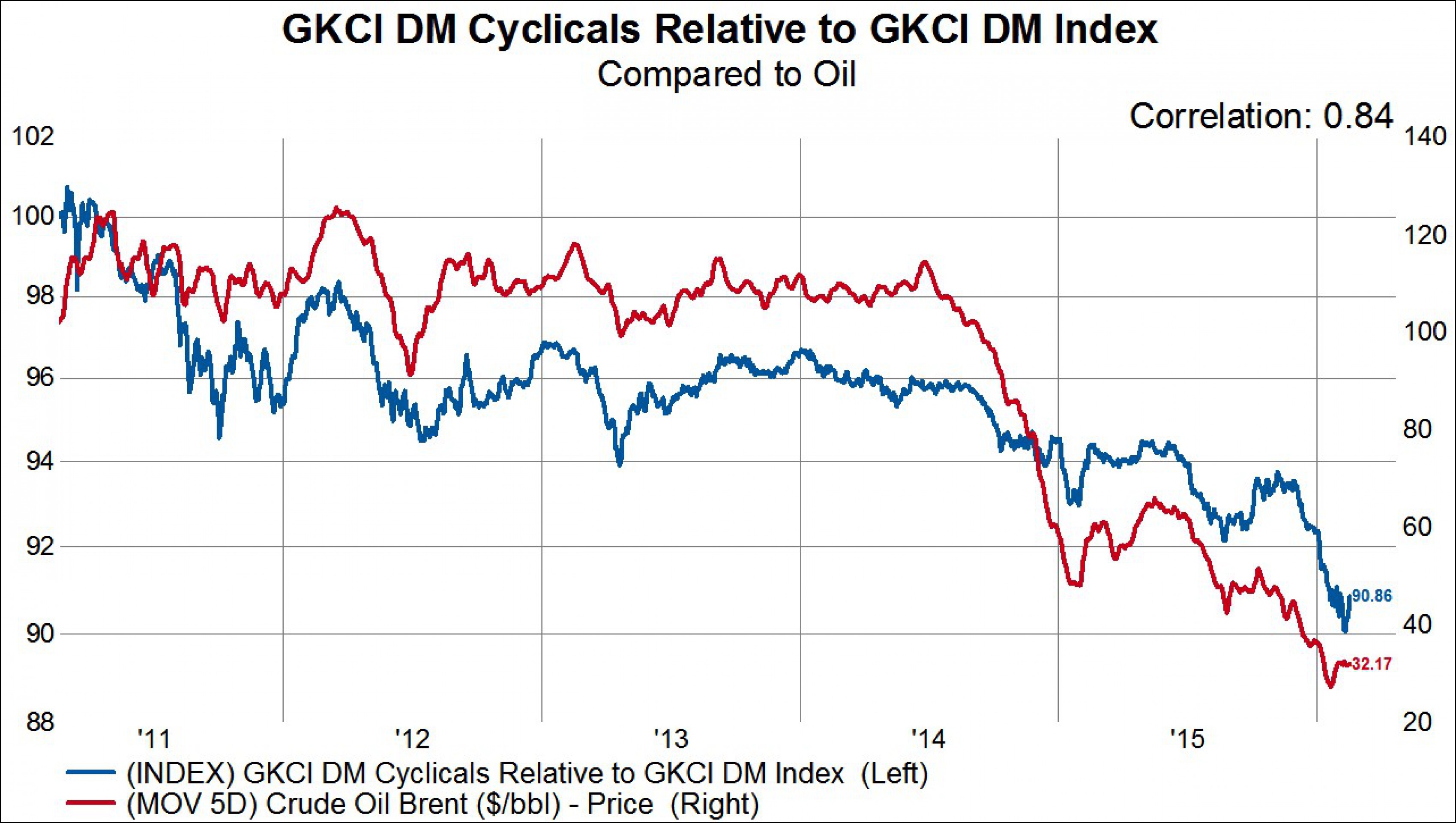 Понятно, что на рынке торгуется масса компаний, деятельность которых очень сильно связана с ценой на нефть и для которых обвал нефтяных котировок не прошел бесследно (энергетика, финансы, машиностроение, информационные технологии). Индекс GKCI Developed Market cyclical sectors как раз отражает их динамику . На графике ниже показана динамика этого индекса и пятидневная средняя цен на нефть марки Brent. Видно, что за последние пять лет корреляция двух этих индикаторов составляла 85%. Упала нефть - упали и акции.