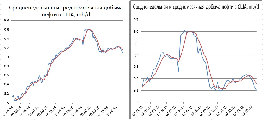 Но более важными становятся данные по динамике добычи. Согласно недельным оценкам среднедневные объемы добычи за неделю, закончившуюся 19 февраля, снизились еще на 33 тыс. бар. в сутки (до 9,102 с 9,135 mb/d неделей ранее). Это на 508 тыс. (-5,3%) баррелей в сутки меньше, чем в максимумах от 5 июня 2015 года и лишь на 6 тыс. баррелей больше, чем в минимуме прошлого года от 16 октября. Добыча все увереннее идет на второй заход снижения и, будем надеяться, что снижение в последующем получит дальнейшее развитие.