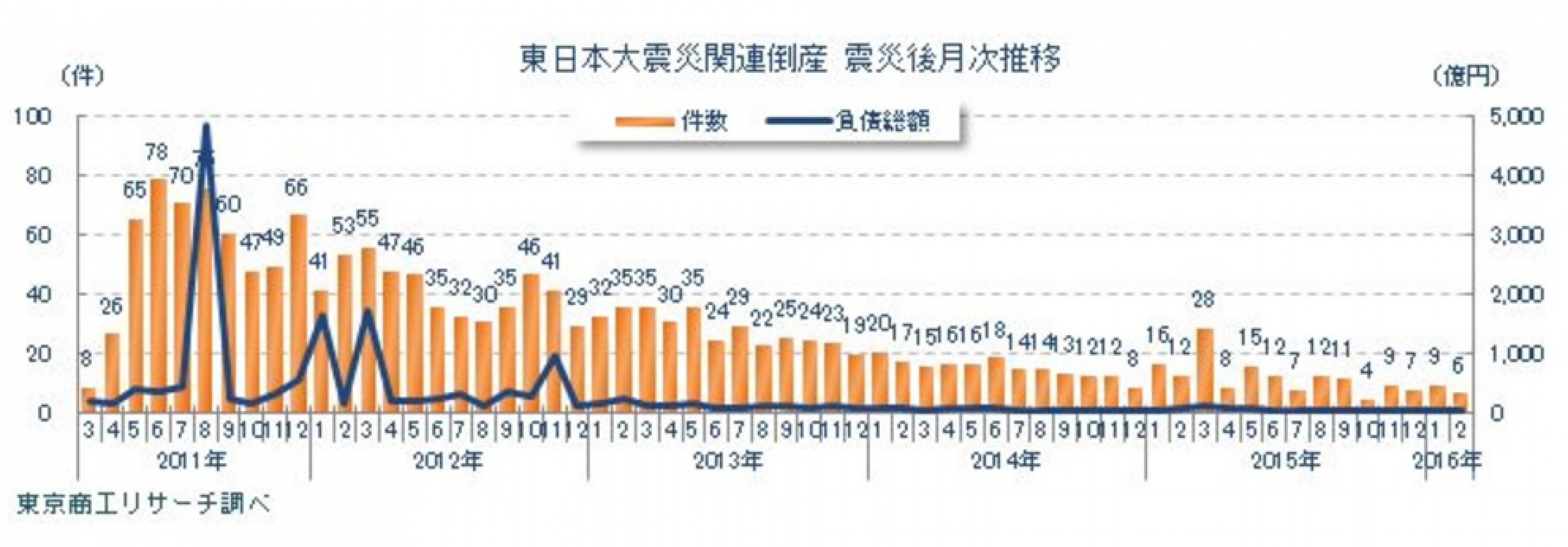 В Tokyo Shoko Research отмечают, что после 2011 г. 90% компаний обанкротились из-за косвенных причин: компании потеряли клиентов и поставщиков. Непосредственные разрушения офисов и предприятий стали причиной лишь 8,3% от общего числа банкротств.