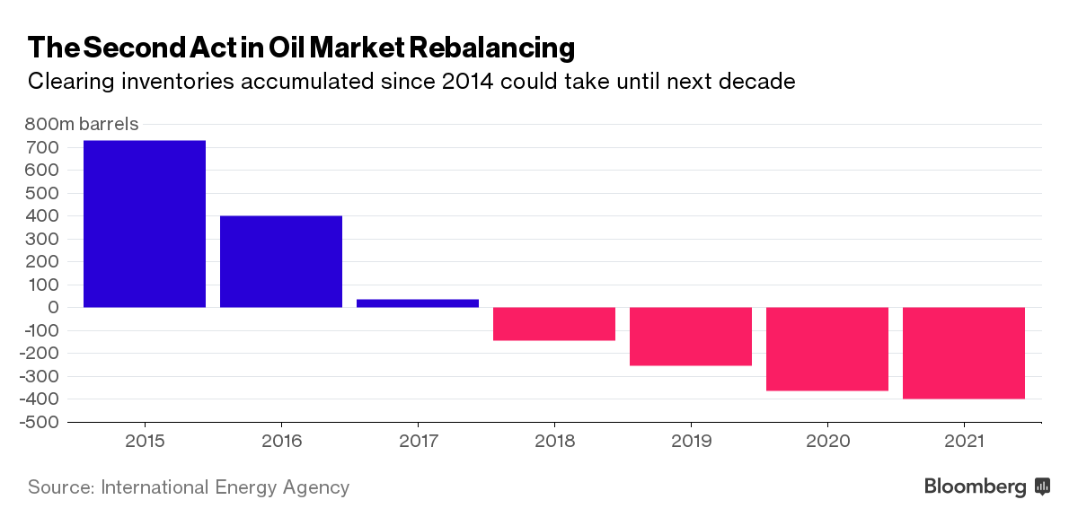 Даже если Саудовская Аравия победит сланцевых производителей США, страна столкнется с другим противником. Это не Иран, не восстанавливающийся Ирак или не давний конкурент - Россия. Ответ проще: даже после окончания перепроизводства, избыток запасов нефти более чем в 1 миллиард баррелей, накапливавшийся с 2014 года, останется на месте, продолжая оказывать давление на цены. Запасы нефти продолжат накапливаться до конца 2017 года, прогнозирует МЭА, а на зачистку излишек уйдут годы.