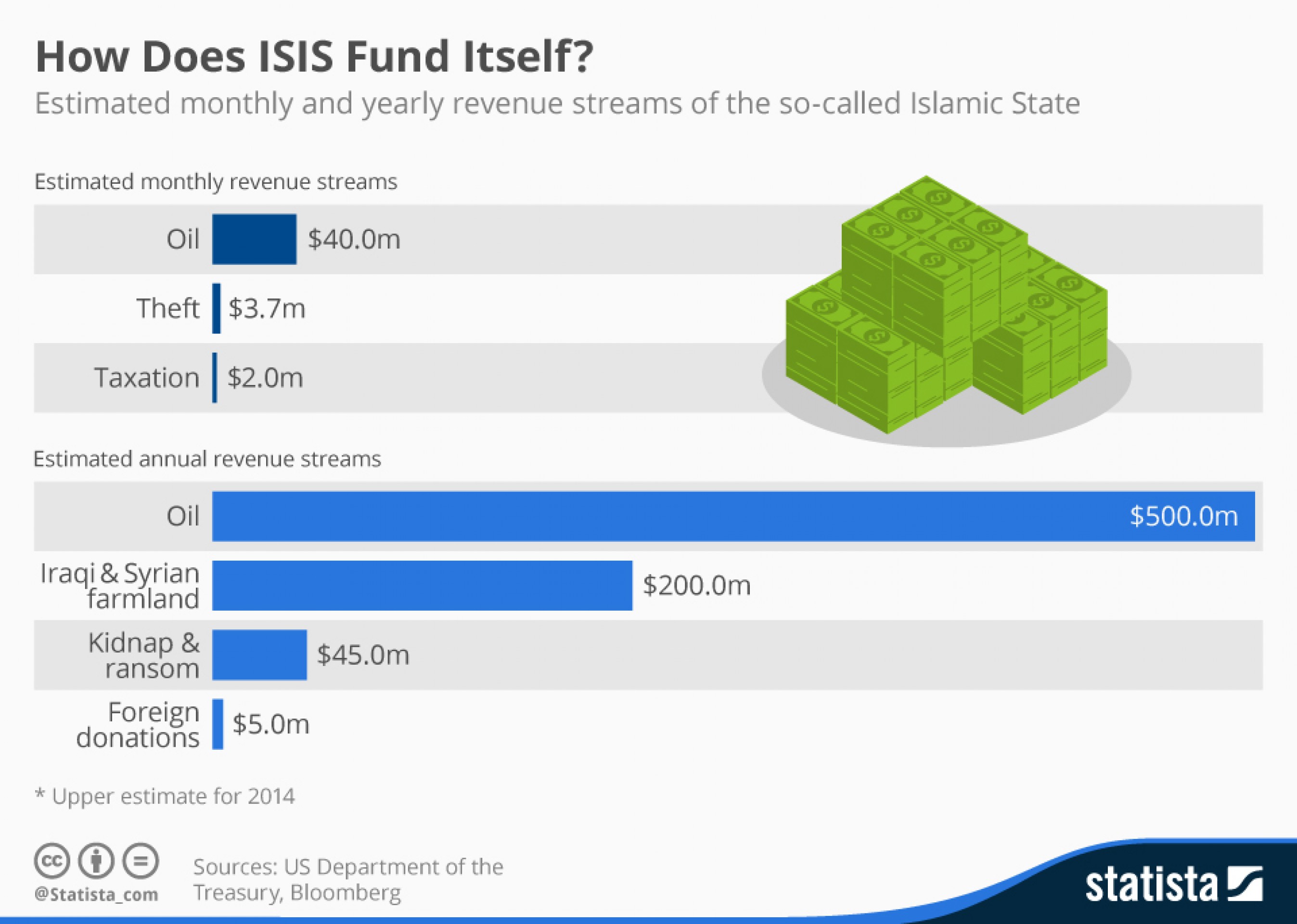 Торговля на валютных рынках Ближнего Востока приносит им порядка $20 млн в месяц и наряду с продажей нефти и вымогательствами является основным источником дохода. По информации комитета по противодействию финансированию терроризма, средства для проведения этих операций группировка получила после захвата филиала Центрального банка Ирака в 2014 г. Там, по имеющейся информации, осталось $429 млн. Кроме того, по словам главы подкомитета по противодействию финансированию терроризма Джона Бэйрона, деньги для спекулятивных операций они также берут из пенсионных выплат, перечисляемых иракскими властями жителям районов.