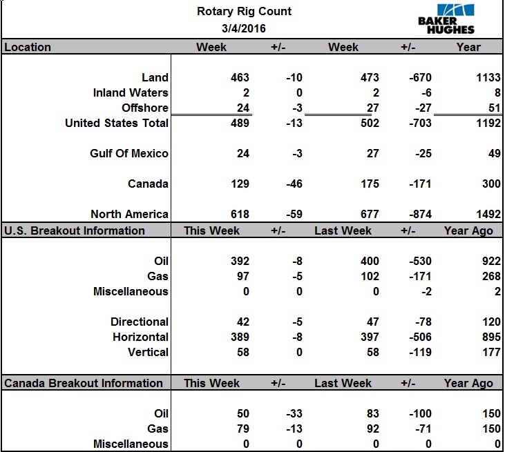 Вышла свежая порция данных от компании Baker Hughes на 4 марта. За прошедшую неделю в США зафиксировано новое снижение количества буровых. Общее снижение составило 13 штук. А снижение количества нефтяных буровых на 8 шт. до 392 штук (это 24,4% от максимума осени 2014 года). Даже после возобновления активного снижения количества буровых с осени прошлого года потери составляют уже более 40%.