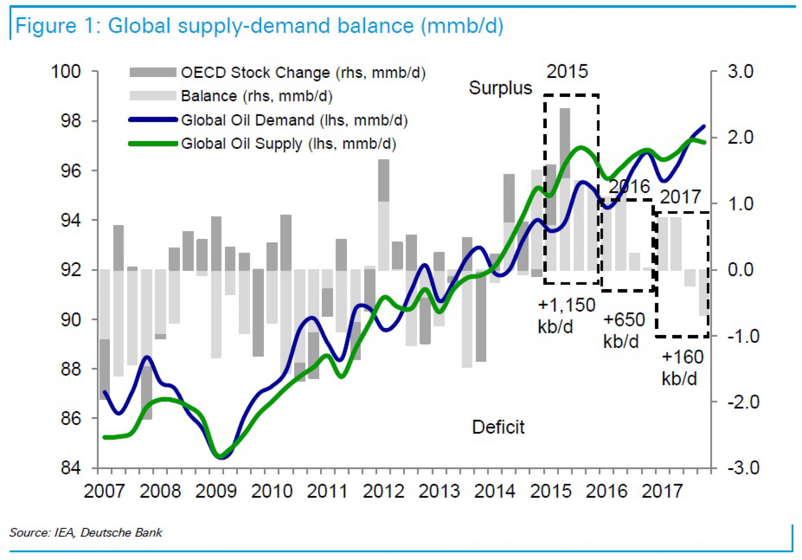 Deutsche Bank ожидает, что в ближайшие годы профицит нефти на рынке по сравнению с показателями 2014 г. снизится. Во второй половине 2017 г. установится дефицит.
