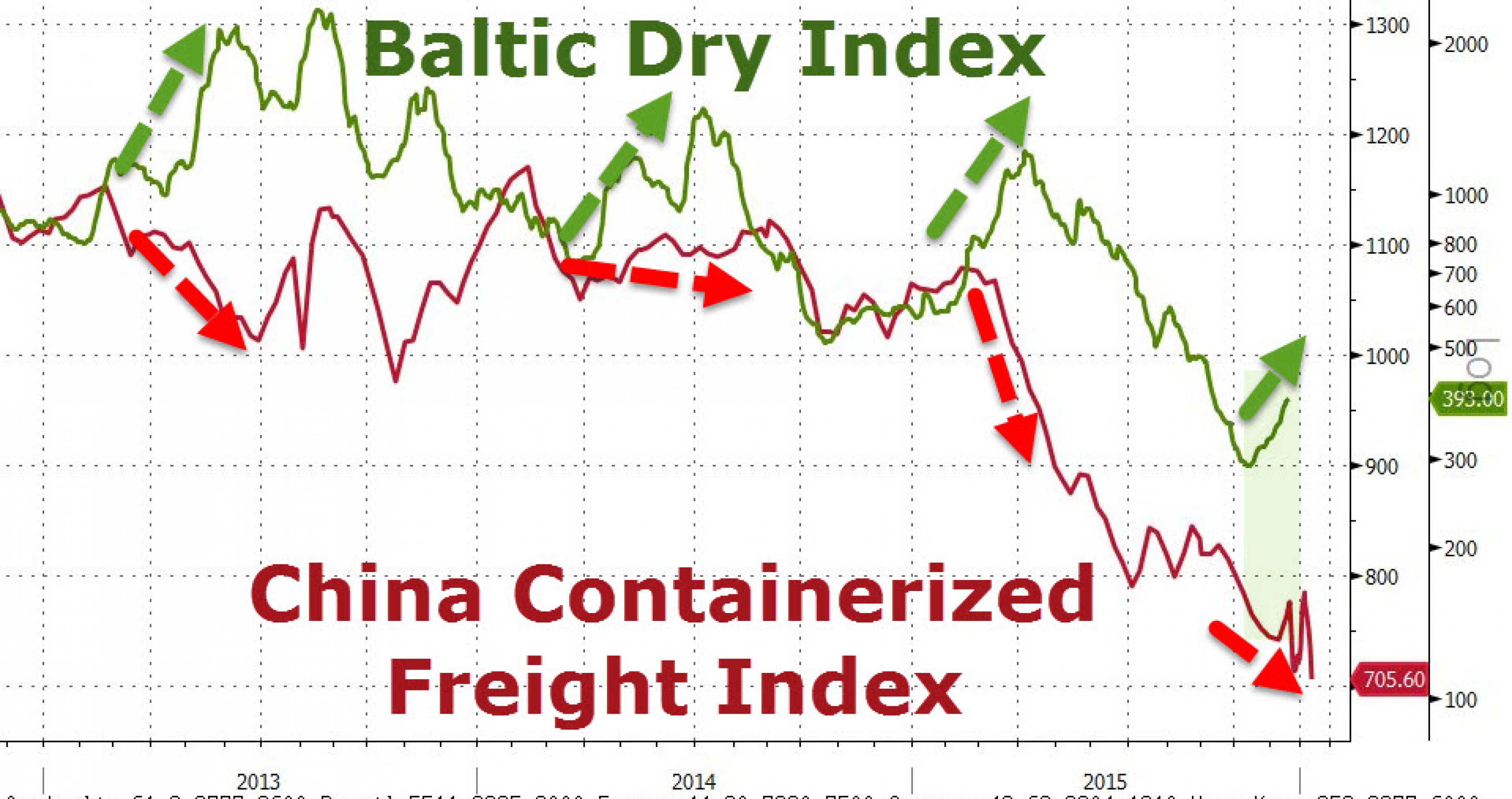 И если внимательно посмотреть на график, то мы увидим, что после роста Baltic Dry Index при падении China Containerized Freight Index почти всегда падал.