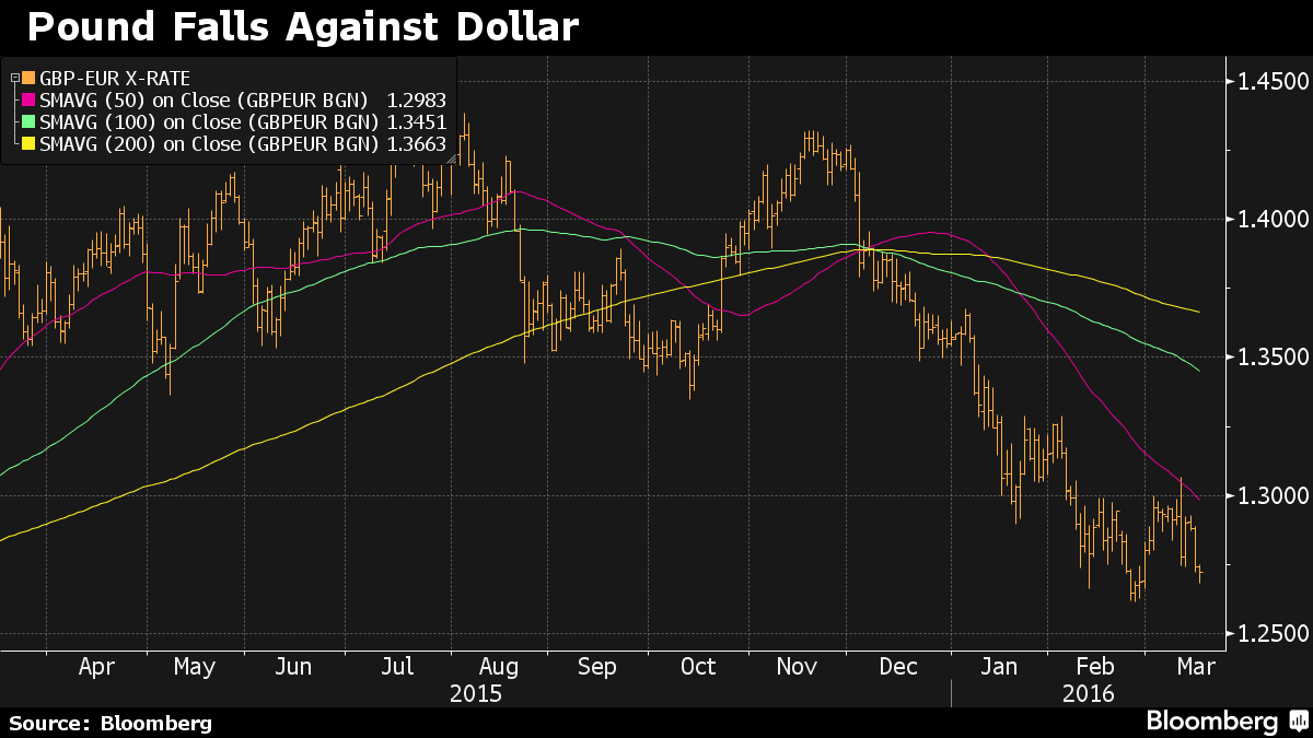 Фунт. Британская валюта, падавшая против всех основных валют в этом году, упала еще ниже после снижения прогнозов на рост в 2016 году до 2% с 2.4%. Фунт торгуется около минимального уровня с 2009 года против доллара и с 2014 года против евро.