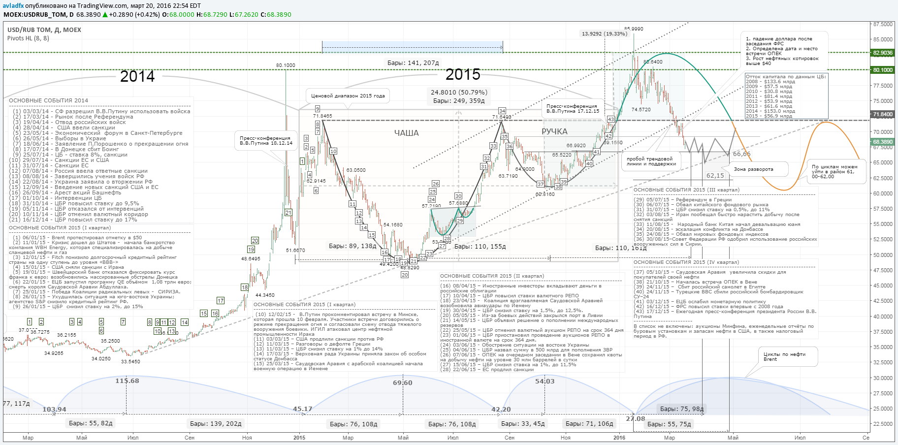 Хронологию важных событий, которые оказывали влияние на рубль в прошлом году, легко отследить на дневном графике пары доллар/рубль ниже. События сгруппированы в блоки по кварталам, и каждое имеет свою нумерацию, которая размещена на линии модели «чаша с ручкой».