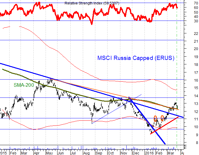 На этой неделе индекс MSCI Russia Capped (ERUS) снизился до двухсотдневной средней и «быки» получили моральное право «разыграть» отскок котировок наверх. В большинстве случаев, когда биржи Запада закрыты на выходные, инвесторы чувствуют себя уверенно. Новость о том, что следующем Премьер-министром Украины может стать Владимир Гройсман также в пользу «быков». Несмотря на то, что Владимир Гройсман ранее отметился рядом антироссийских высказываний, политический кризис на Украине не в интересах России. В силу сложившихся обстоятельств Гройсман направит свои основные усилия в 2016 году на стабилизацию экономической ситуации на Украине, а не на политическую конфронтацию с соседними странами. Арсений Яценюк в этом плане безнадежен. Госсекретарь США Джон Керри и президент России Владимир Путин вчера провели встречу, на которой обсуждались вопросы, связанные с положением на Украине и американская сторона считает эту встречу продуктивной.