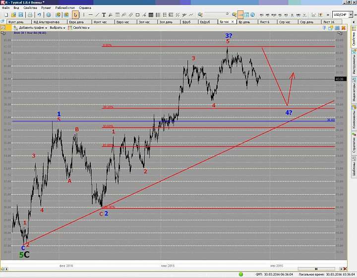 Продолжается развитие нисходящей коррекции относительно законченного восходящего импульса, пока обозначенного как синяя волна 3. Нельзя забывать, что этот импульс может быть лишь волной 1 в составе синей волны 3. Независимо от выбора варианта нисходящая коррекция не может одновременно пробивать нижнюю сигнальную линию и уровень максимума в составе синей волны 1, обозначенный горизонтальной синей линией. Текущая коррекция может пробить только одну из этих линий, либо ни одной.