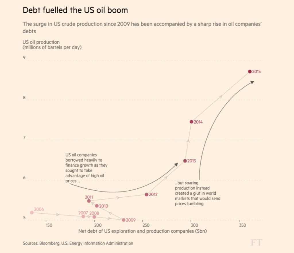 Уже не секрет, что сланцевый бум - как по нефти, так и по газу - осуществлялся как бы взаймы. Нефтегазовые компании, активно эксплуатировавшие технологию гидроразрыва пласта, в целом известную с 1960-х гг., ещё более активно накапливали долги.