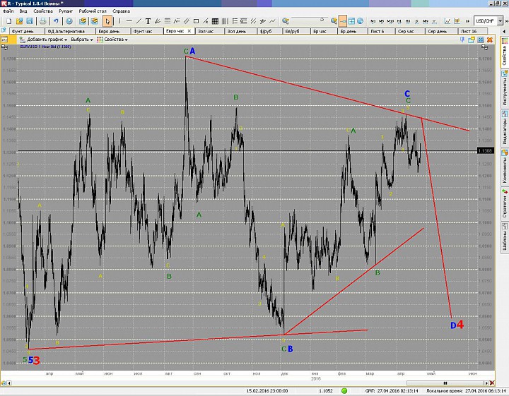 В том виде, в котором сейчас существует текущее восходящее движение, оно не может быть признано частью восходящего импульса (это отношение может измениться по мере развития событий). В сегодняшнем виде этот участок может быть признан частью восходящего терминального импульса, в этом случае всё восходящее движение, начиная с 29.02 2016 года, зигзаг, и по окончанию текущей волны нас ожидает ещё как минимум один заход к историческим ценовым минимумам в районе 1,39. Второй вариант трактовки этого участка (показан на графике) предполагает структуру двойной плоской коррекции с малой Х-волной. В этом случае, несмотря на обновление максимума, мы всё ещё находимся в процессе формирования зелёной волны В в составе синей волны 2. Тогда следующее нисходящее движение должно иметь импульсную структуру, пробивать все нижние сигнальные линии, но будет ограничено примерно уровнем 1,41, после чего восходящий тренд будет продолжен.