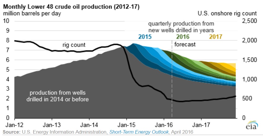 Другой блок выходящих сегодня данных будет касаться непосредственно нефтяного рынка. Выйдут данные по запасам и добыче нефти в США. Данные о запасах интересны тем, что где-то в средине весны (как это было в прошлом году) рынок ожидает начала снижения запасов. А вот по динамике добычи ожидания прежние – снижение продолжится. Да и само EIA ожидает до конца 2016 года продолжения снижения добычи. Хотя буровая активность, по их мнению, уже скоро начнет возрастать. Так что очень интересно будет увидеть сегодня свежие недельные данные по запасам и добыче нефти в США.