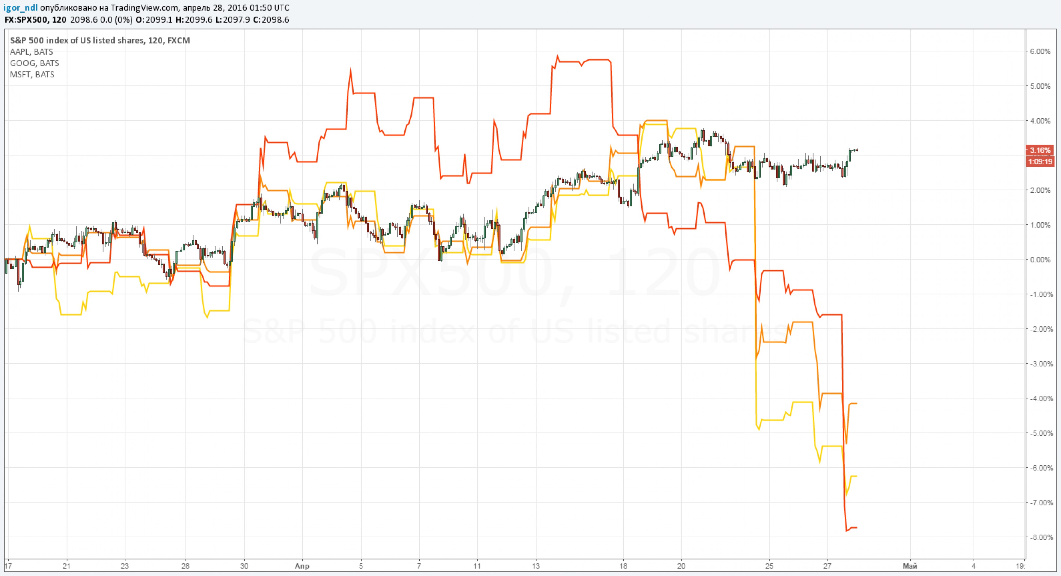 Но этого не произошло, индексы даже сумели вырасти, а потери от высокотехнологичного сектора компенсировали акции энергетического и банковского секторов. Ниже приведем график, на котором представлен индекс S&P 500 и акции трех технологических гигантов. Комментарии здесь излишни.