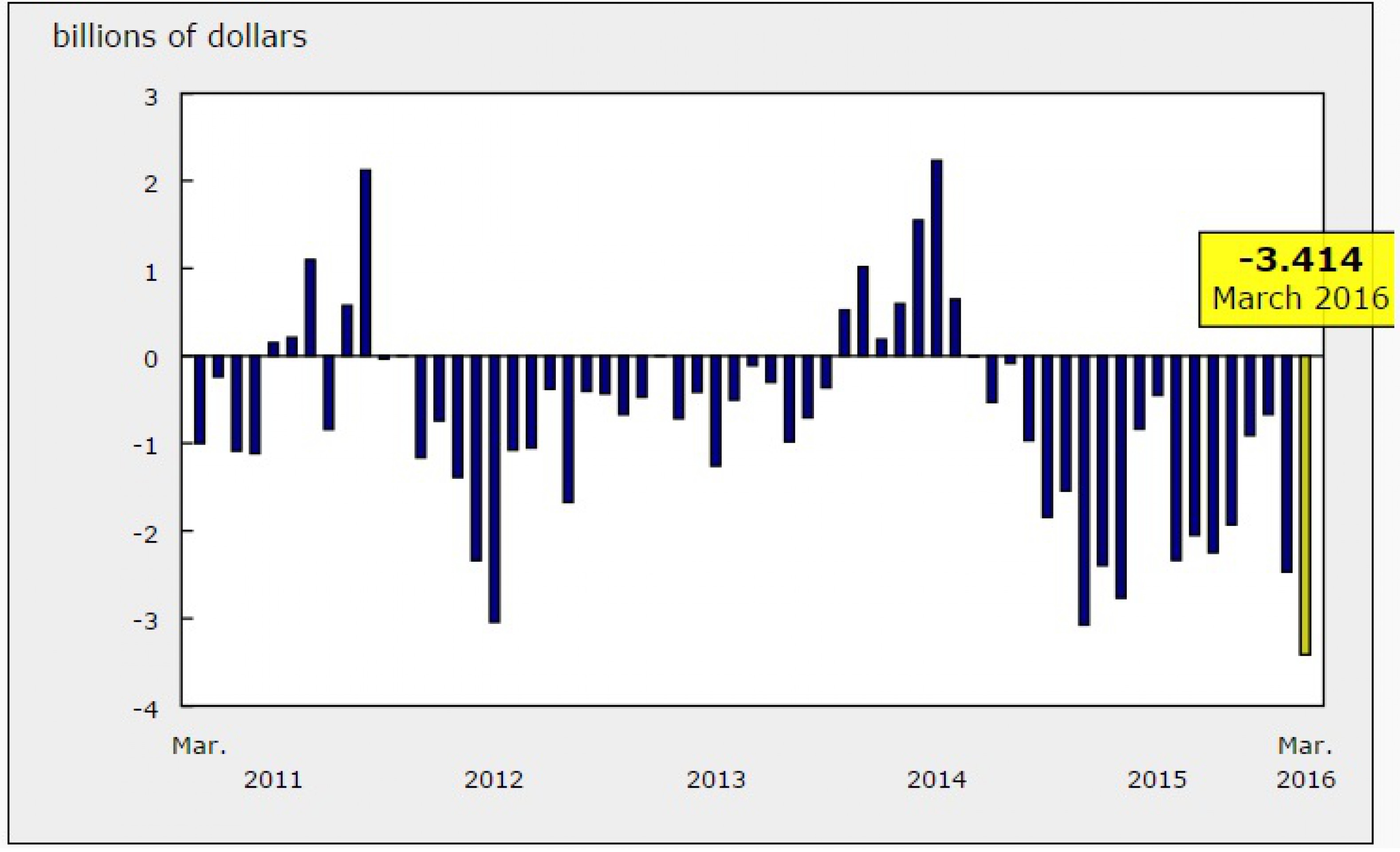 Канадская экономика в марте 2016 г. продемонстрировала наиболее крупный дефицит торгового баланса в своей истории из-за резкого сокращения экспорта. В частности, объем канадского экспорта в США упал до минимума за последние 23 года.