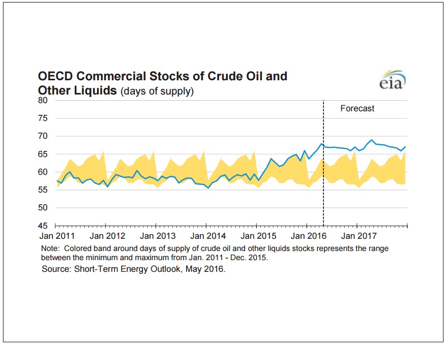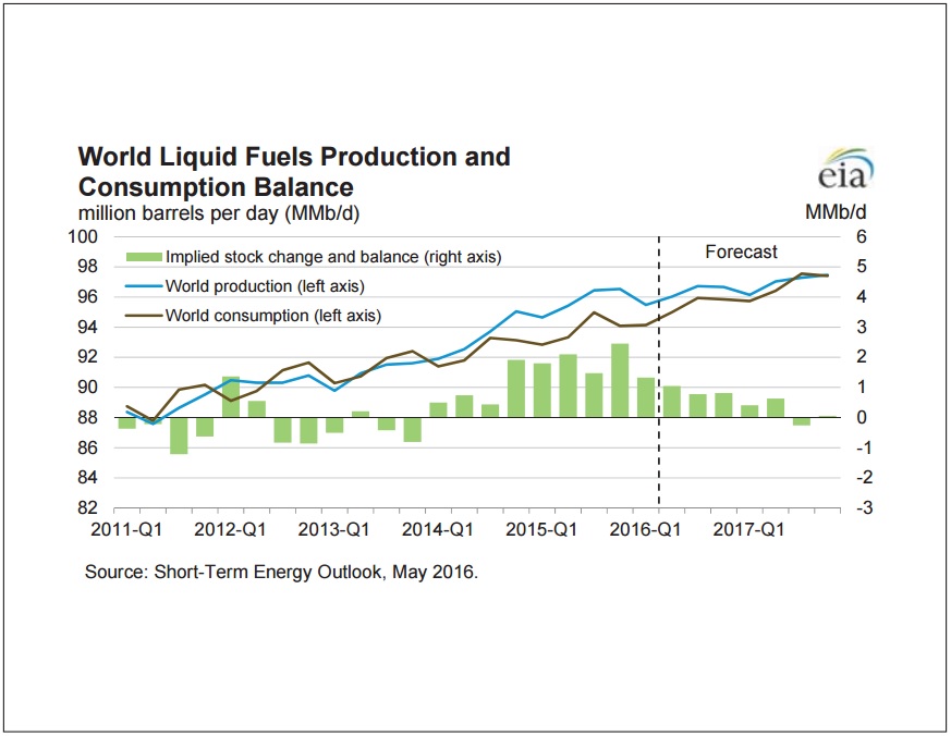 Энергетическое информационное агентство EIA (подразделение Министерства энергетики США) выпустило майский обзор (http://www.eia.gov/forecasts/steo/pdf/steo_full.pdf). В EIA прогнозируют рост потребления жидких углеводородов в мире в 2016 году на уровне 1,43 mb/d (до 95,24 mb/d), а в 2017 на 1,54 mb/d (до 96,78 mb/d). В основном рост потребления вновь будет обусловлен опережающим ростом спроса в странах Юго-Восточной Азии. Рост предложения будет идти не такими активными темпами в результате избыточное предложение будет постепенно снижаться и постепенно сойдет на нет.