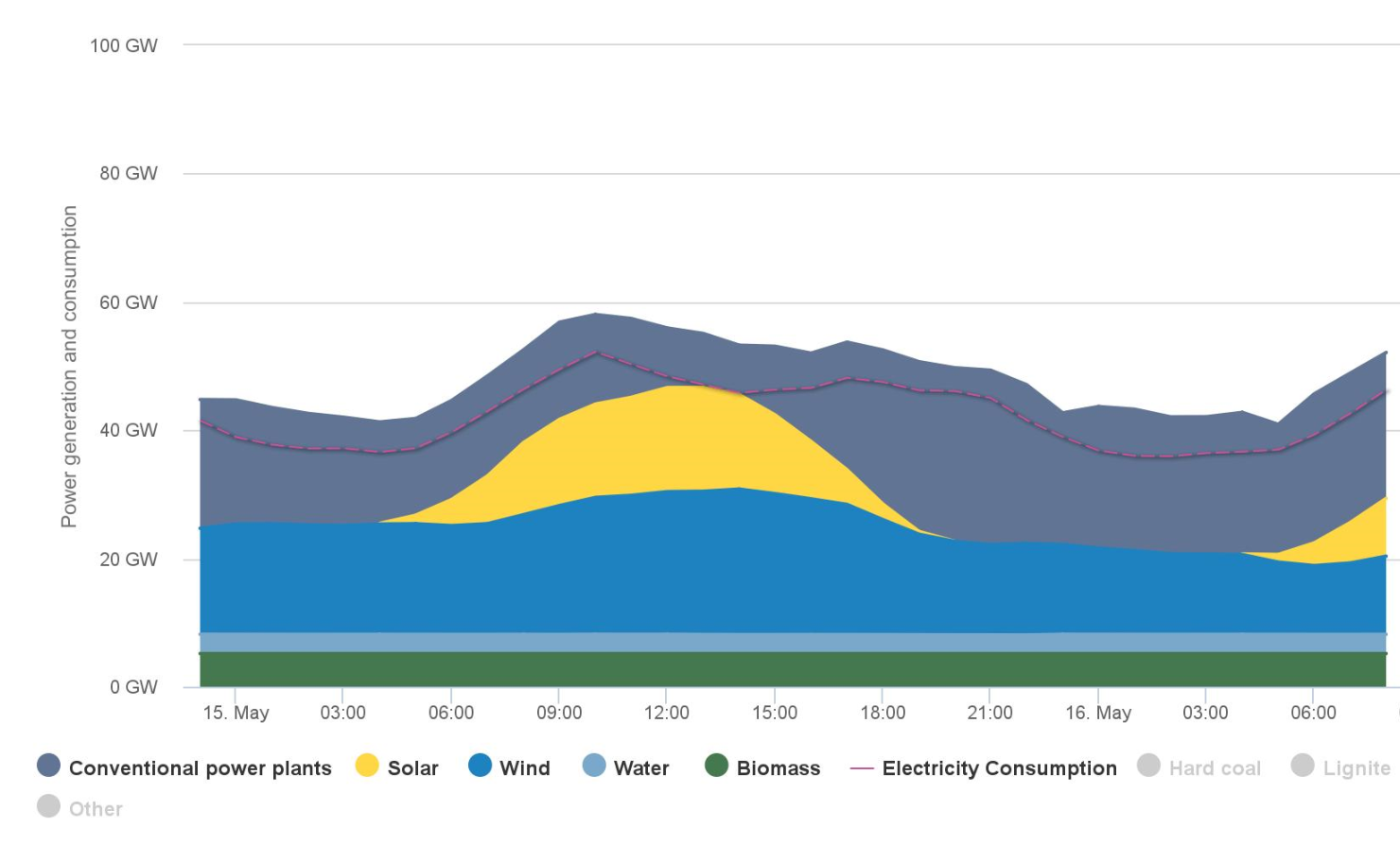 Солнечная и ветровая энергия достигли своего максимума в 14 часов по местному времени в воскресение, обеспечивая 45.5 гигаватт при спросе 45.8 гигаватт, по предварительным данным исследовательского института Agora Energiewende в Берлине. По данным Epex Spot, цены на энергию становились отрицательными несколько 15-ти минутных эпизодов вчера, упав до -50 евро за мегаватт-час.