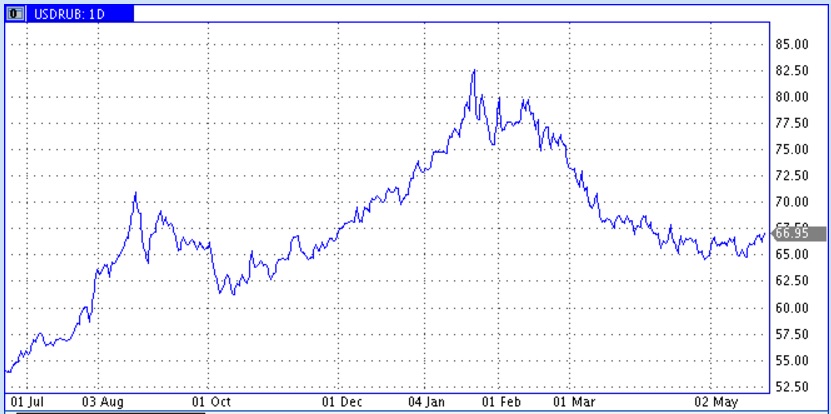 За прошлую неделю рубль заметно отошел от максимальных отметок. Ожидания ослабления рубля после длительного и очень убедительного периода роста национальной валюты становятся все более выраженными. Пока они немного сдерживаются налоговым периодом. Однако главный фактор – цены нефти все более грозят сменой наблюдавшегося в последние месяцы тренда. Вероятно, что более активное движение по рублю проявится в начале июня, особенно если заседание ОПЕК будет (уже традиционно) провальным для «ожидателей» фиксации уровней добычи со стороны картеля. Все более выраженные ожидания снижения ставки ЦБ тоже будут играть на руку ослаблению национальной валюты. (Напомним, что очередное заседание Банка России намечено на 10 июня).