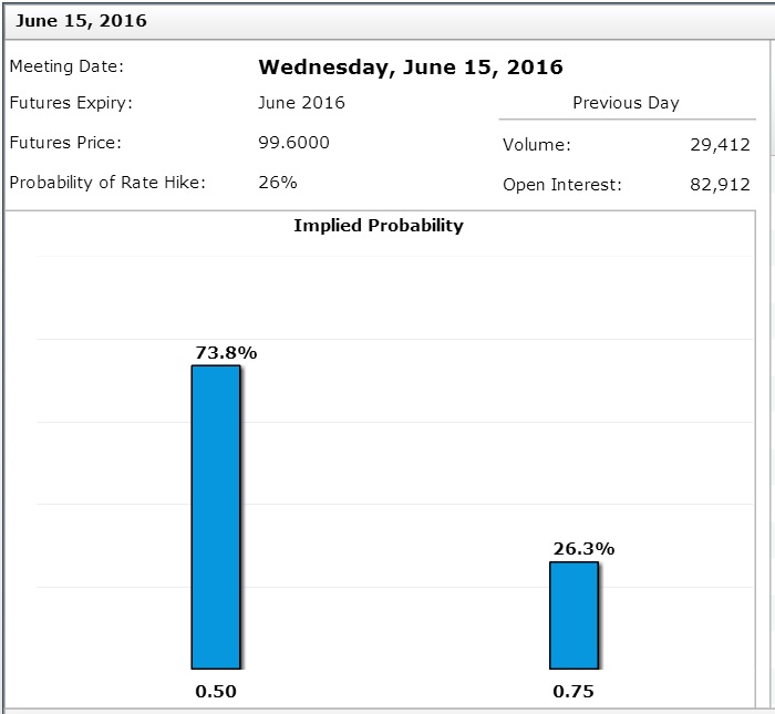 Предыдущая неделя на рынках была относительно спокойной. Вышедший 18 мая протокол апрельского заседания ФРС был явно ястребиным и указывает на возросшие намерения на возможное повышение ставки уже на июньском заседании. Последующие высказывания членов Комитета тоже отличались явной агрессивностью. Так Стенли Фишер обращает внимание, что "экономика США приближается к полной занятости и целевому уровню инфляции», Дадли считает, что ФРС было бы целесообразно повысить процентные ставки еще раз: либо в июне, либо в июле", а Лэкер отмечает снижение глобальных рисков. Однако, несмотря на прямые намеки протокола, а так же ястребиный настрой членов Комитета, рынок пока не особенно верит в возможность повышения ставки в июне. На конец прошедшей недели рынок оценивал такую вероятность лишь в 26,3%. Зато после июльского заседания оценка рынком вероятности сохранения ставки на прежнем уровне опустилась ниже 50% и на конец прошлой недели составила 47,4%. Так что начало лета обещает проходить в ожидании разрешения главной рыночной интриги со ставками ФРС.
