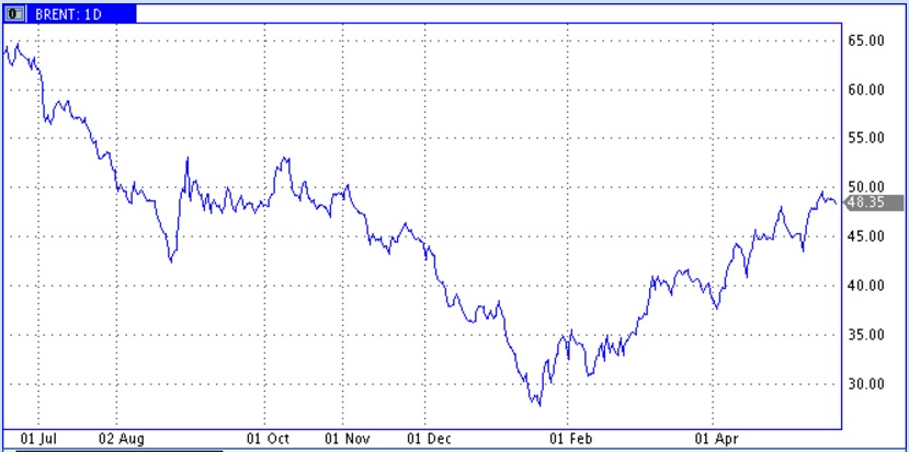 Цены нефти после 80% роста с начала года приблизились к 50 долларам за баррель и теперь находятся вблизи зоны сильного сопротивления. Преодоление этой зоны достаточно проблематично. Напомним, что заметный вклад в подрастание цен нефти в последние месяцы был связан с ослаблением доллара. Ослабление происходило с конца прошлого года за счет размягчения планов ФРС по повышению ставки в 2016 году и мягкого сползания их ожиданий с 4 планировавшихся в конце 2015 года повышений до одного - максимум двух повышений на настоящее время. И все же помним, что теперь повышению ставки формальных препятствий стало немного меньше. В ожидании повышения ставки доллар будет тяготеть к укреплению, а цены нефти (как и фондовые рынки) к снижению.