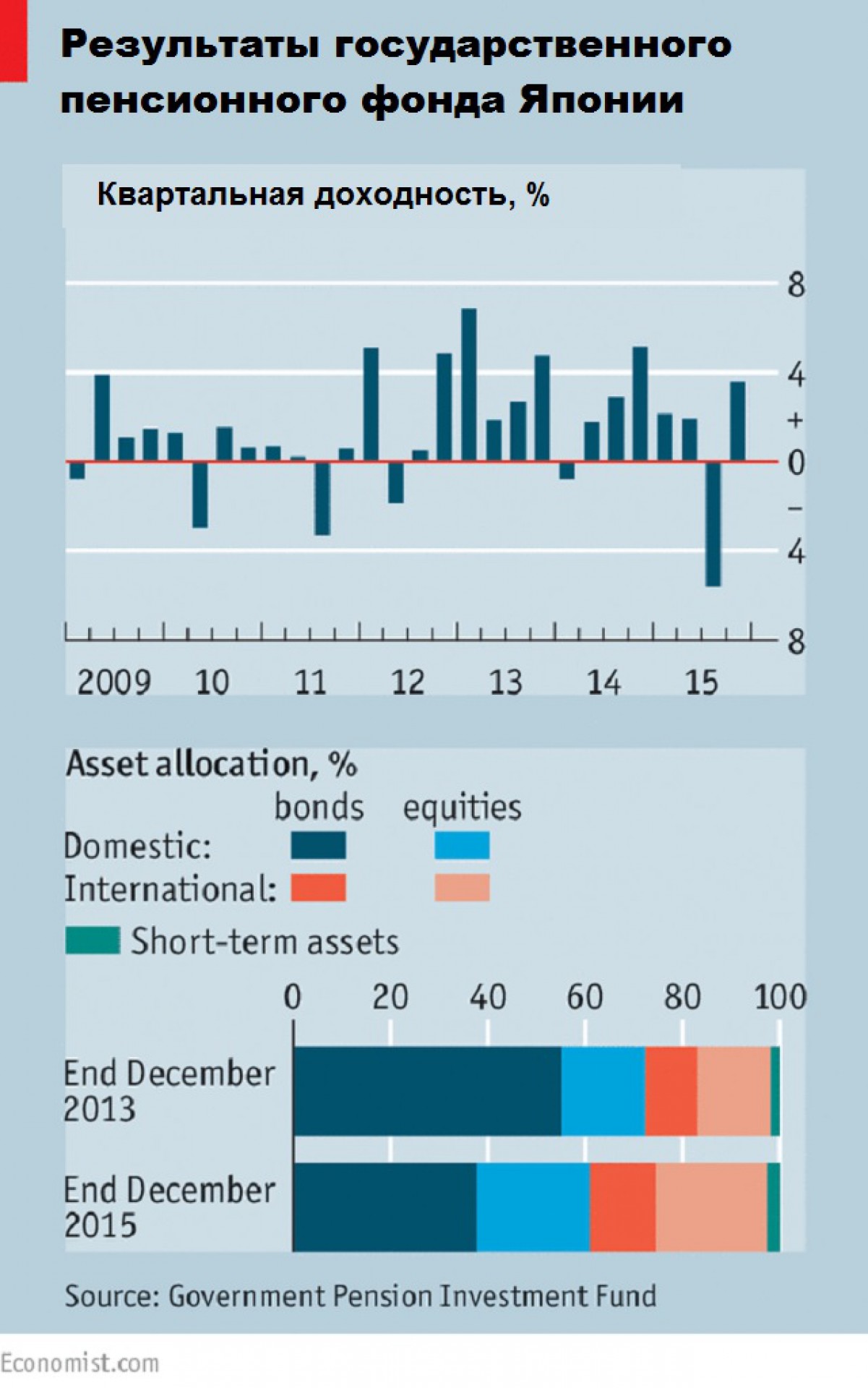 Но после впечатляющего всплеска японские акции (и некоторые зарубежные ценные бумаги) резко пошли вниз. Иена также укрепилась, уменьшив стоимость иностранных активов. Все это привело к тому, что самый большой в мире пенсионный фонд потерял, по оценке аналитиков, более 5 трлн иен в недавно завершившимся финансовом году, отмечает британский журнал The Economist.