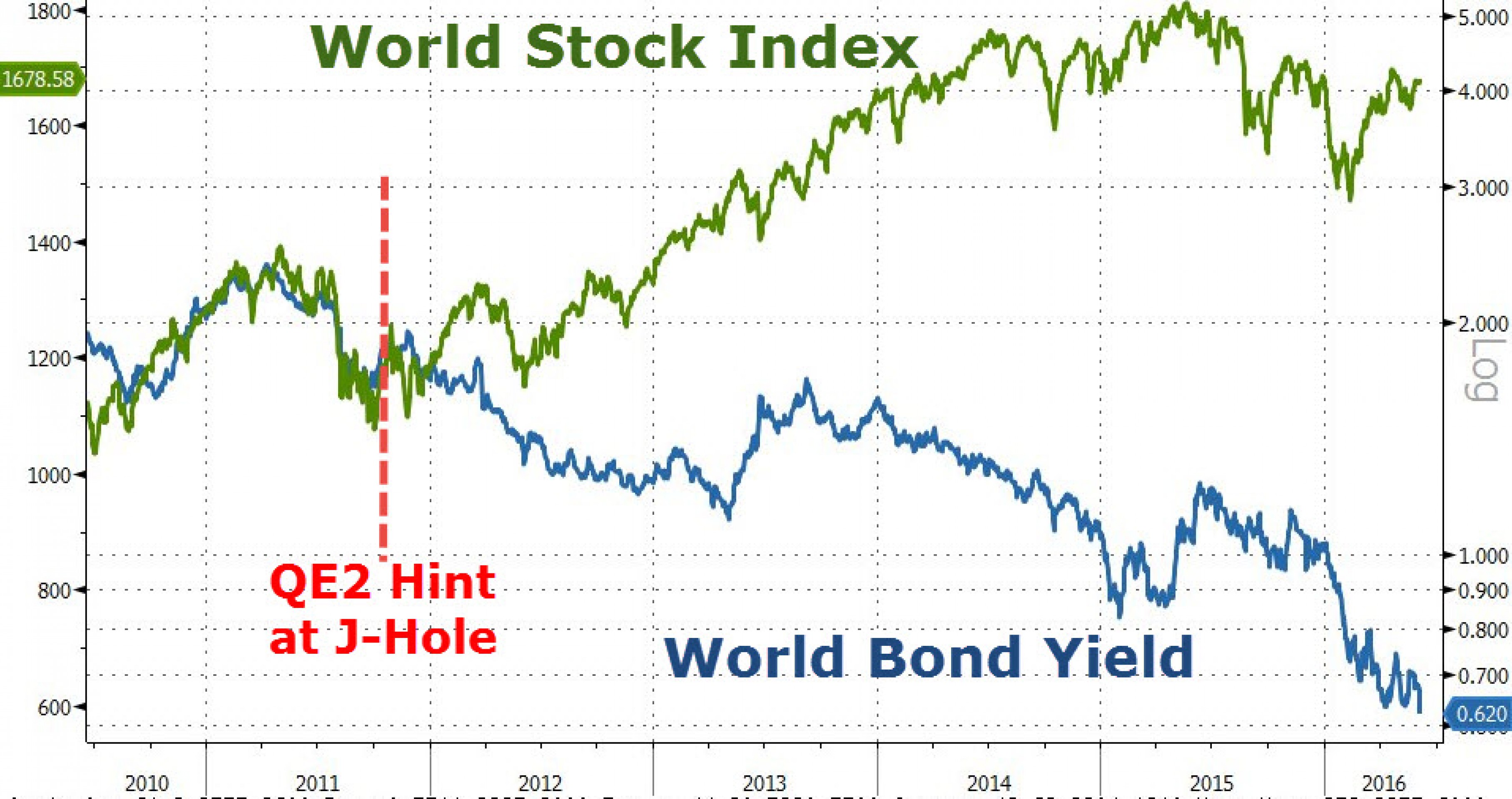 На этом фоне Bloomberg's Developed World Bond Yield, то есть индикатор, отслеживающих доходность облигаций развитых стран, опустился до рекордного минимума в 62 базисных пункта. Любопытно, что доходность облигаций уже давно движется в противоположную сторону от того, что напрогнозировали экономисты. Началось это все в 2011 г., когда Бен Бернанке в Джексон-Хоуле фактически объявил о скором запуске QE2.