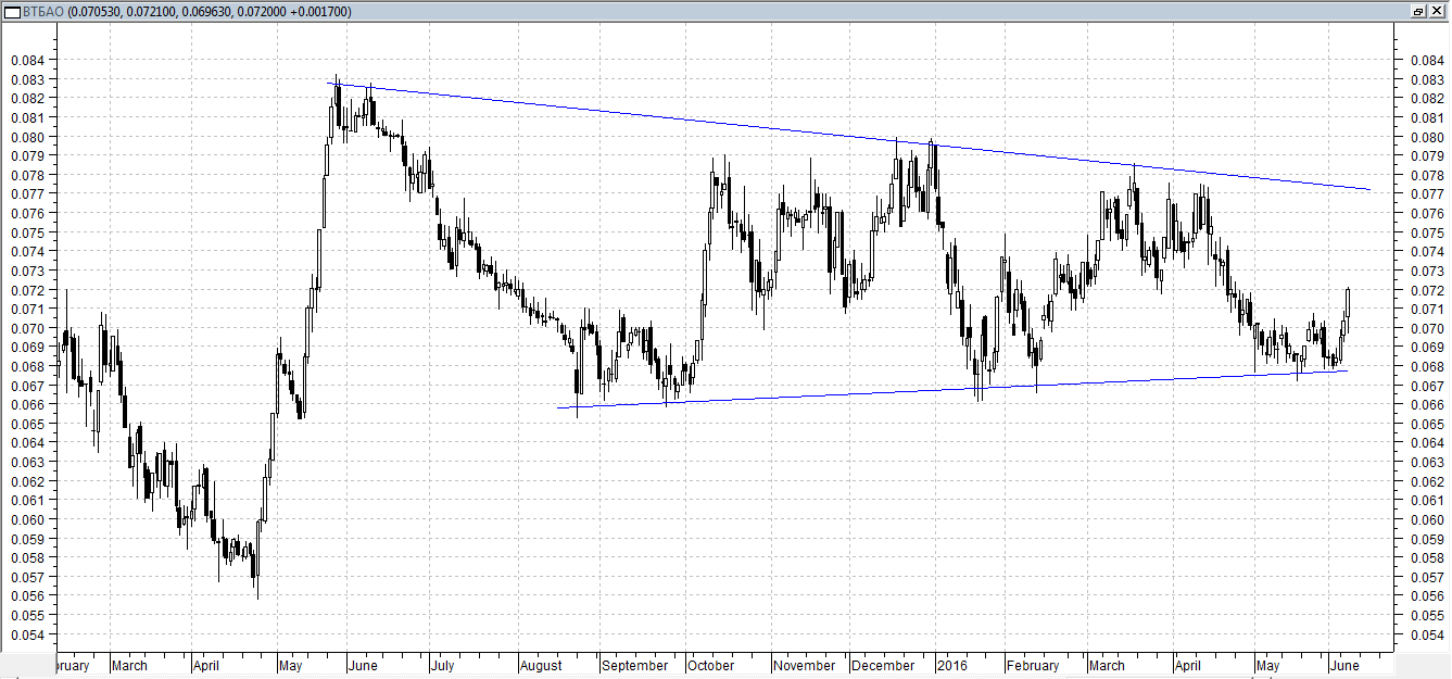 ВТБ – акции госбанки с прошлого года находятся в боковой коррекции, в виде сужающегося бокового тренда. В начале июня началось подрастание акций ВТБ от нижней границы боковика. Боковая динамика акций ВТБ в 2015 году была связана с тем, что в 2014 году рост акций составил более 100%. По итогам января – марта 2016 года ВТБ показал положительные результаты. Чисты процентные доходы в 1 квартале 2016 года выросли на 124,1% - до 98,3 млрд. руб. Чистая прибыль составила 0,6 млрд. руб., по сравнению с убытком в аналогичном периода предыдущего года. Технически акции ВТБ смотрятся положительно, в ближайшей перспективе можно ожидать повышения к отметке 0,077 руб., от текущих уровней.