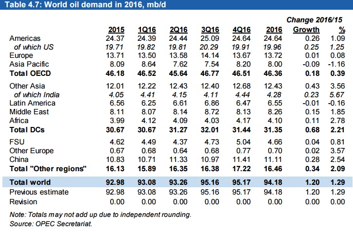 Оценка роста мирового спроса на нефть на 2016 год осталась неизменной по сравнению с предыдущим докладом (+1,20 mb/d до 94.18 mb/d в 2016 г.). Основной вклад в прирост спроса дают страны Азии, во главе с Индией.