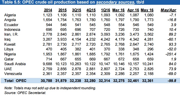 По данным ОПЕК глобальные поставки нефти снизились на 0,73 mb/d в мае по сравнению с предыдущим месяцем, в среднем 94.51 mb/d. (ОПЕК снизило на 0,1 mb/d, и остальные страны на 0,63 mb/d). Доля ОПЕК в общем объеме мирового производства увеличилась до 34,2% в мае. Напомним, что два года назад в июне 2014 года доля ОПЕК в мировой добыче нефти составляла 32,7%