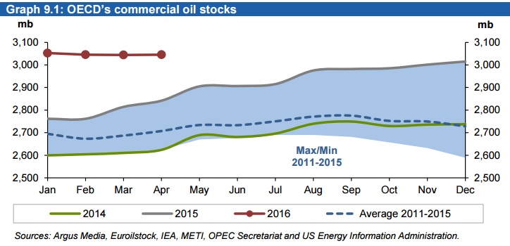 Запасы товарной нефти ОЭСР (Организации экономического сотрудничества и развития) в апреле незначительно подросли до 3,046 mb. (66,4 дней их потребления). Изменения запасов в последние месяцы не очень значительно, но они на 338 mb (+7,1 дня) превышают средние значения за последние пять лет.