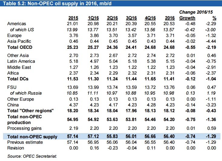 ОПЕК прогнозирует, (как и в предыдущем обзоре), что для стран не входящих в картель добыча за год снизится на 0.74 mb/d до 56.40 mb/d в 2016 году. Нисходящие изменения в Канаде, Бразилии и Колумбии компенсировано пересмотром в более благоприятную сторону для добычи в США, Великобритании, России и Азербайджане. А вообще оценка динамики добычи в основных странах не входящих в ОПЕК в 2016 году оценивается следующим образом.