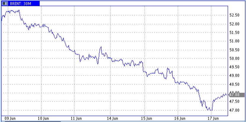 Цены энергоносителей за прошедшие сутки вновь сильно просели. Особенно существенным было снижение цен европейской нефти Brent. Цена по ней в течение дня опускалась чуть ниже 47 долларов за баррель. Это почти на 6 долларов (или на 11%) ниже недавних максимальных отметок. Однако в пятницу настроение на рынке было уже более мажорным и цены начали подрастать. Снижения цен нефти в последнюю неделю взяло слишком высокий темп, и игрокам потребовалась как минимум пауза.