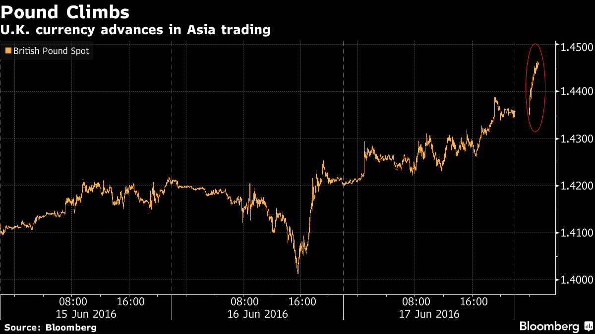 Волатильность по фунту упала до минимума за неделю после выхода опроса, проведенного газетой Sunday, показавшего, что 45% британцев выступают за то, чтобы страна осталась в составе ЕС, тогда как 42% проголосовали против. Фунт рос в конце недели после того, как кампания была приостановлена с обеих сторон после убийства депутата Кокс. Нападение на нее было совершено 16 июня.