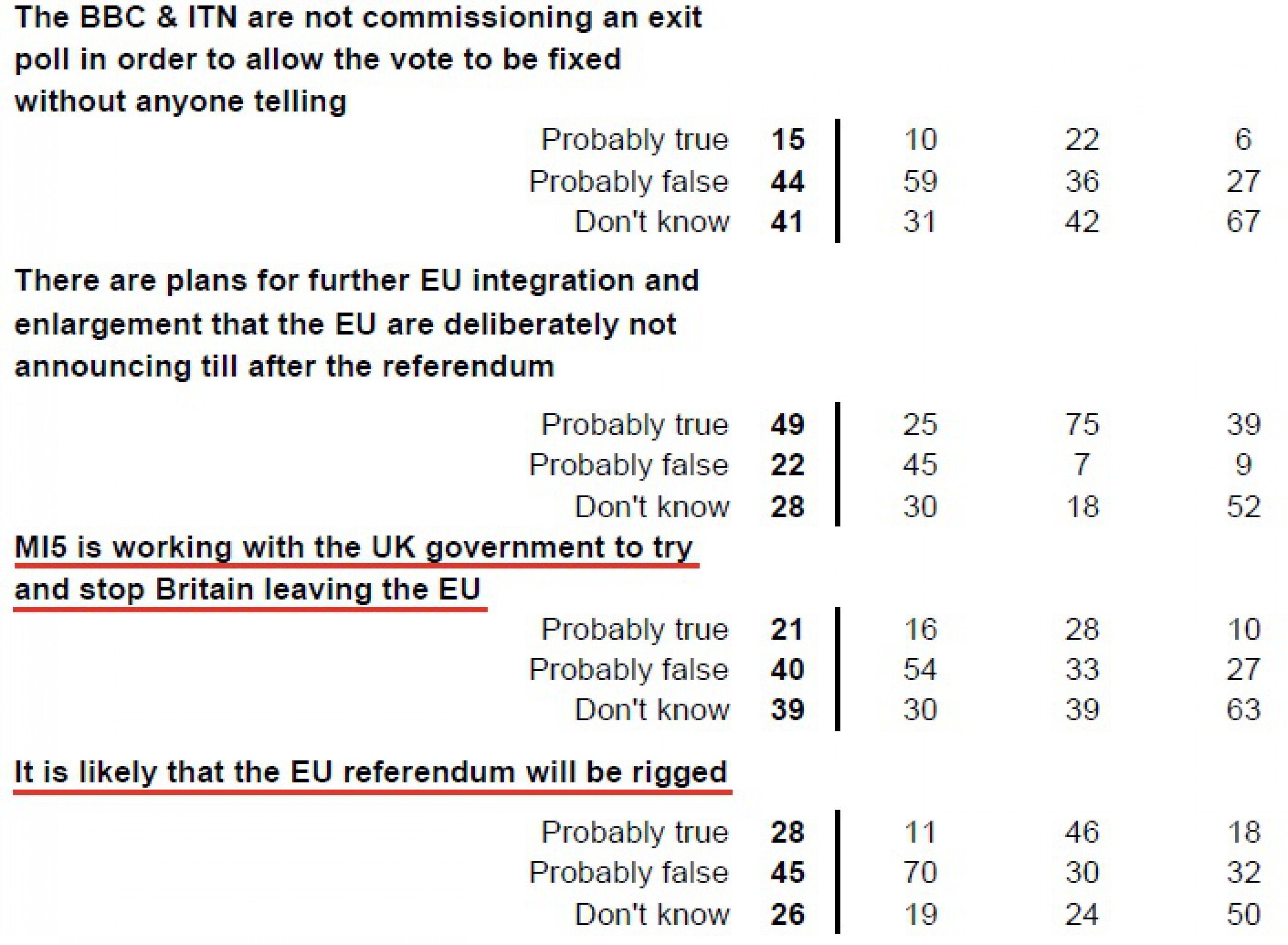 Ряд экспертов отметили, что несмотря на то, что большинство опрошенных все же отвергли теории заговора вокруг потенциальной фальсификации референдума, результаты проведенного опроса показывают: довольно большая группа британцев не доверяет правительству страны в плане проведения референдума.