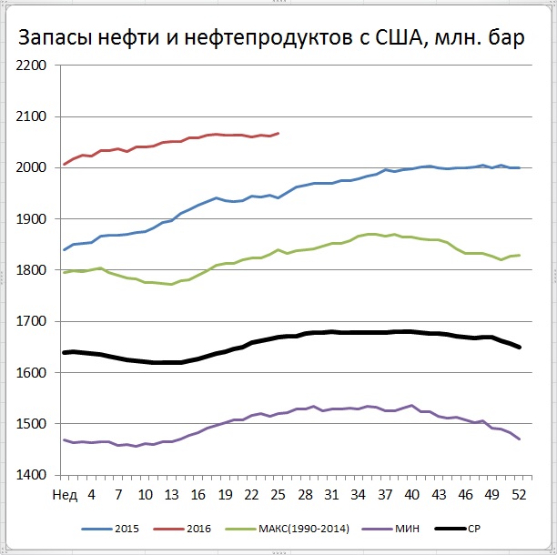 Согласно оценкам среднедневные объемы добычи за неделю, закончившуюся 17 июня, снизились еще на 39 тыс. бар. в сутки (до 8,677 с 8,716 mb/d неделей ранее). От максимумов 5 июня 2015 года добыча ниже уже на 933 тыс. (-9,7%). Снижение добычи продолжилось и установлены новые минимумы за прошедший год. Темп снижения даже ускорился (в пересчете на год недельный обвал идет со скоростью 2 млн. баррелей за год). Да и реальное среднегодовое снижение продолжается возрастающим темпом. За последние пять месяцев дневная добыча опустилась на 558 тыс. баррелей и тенденция на снижение добычи обещает продолжиться. Такого же мнения придерживается и министерство энергетики, которое недавно дало прогноз снижения добычи сланцевой нефти за следующий месяц еще на 118 тыс. баррелей в сутки