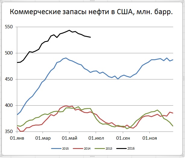 Важнейшим событием прошедшего на рынке нефти стала очередная публикация данных EIA по запасам и добыче нефти в США. За неделю, закончившуюся 17 июня 2016 года, коммерческие запасы нефти в стране снизились на 0,917 млн. баррелей (до 530,626 с 531,543 млн. баррелей неделей ранее). Запасы сырой нефти продолжили снижение и таким образом, все увереннее прорисовывают зафиксированный в конце апреля максимум.