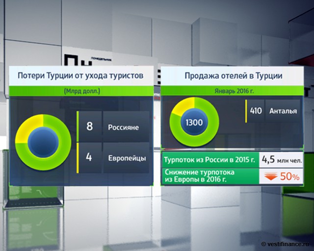 Согласно данным Федеральной таможенной службы (ФТС) торговый оборот между Россией и Турцией по итогам 2014 г. составил более $31 млрд, по итогам же 2015 г. он сократился до $23,4 млрд, а за первые четыре месяца текущего года он составил лишь $4,8 млрд. Фактически по итогам текущего года падение торгового оборота может продолжиться, и уже значение этих потерь превысит $10 млрд. В Турции ущерб от ухудшения отношений с Россией оценивают в 0,3–0,4% ВВП, или $9 млрд. Такими оценками поделился вице-премьер Турции Мехмет Шимшек в декабре 2015 г.