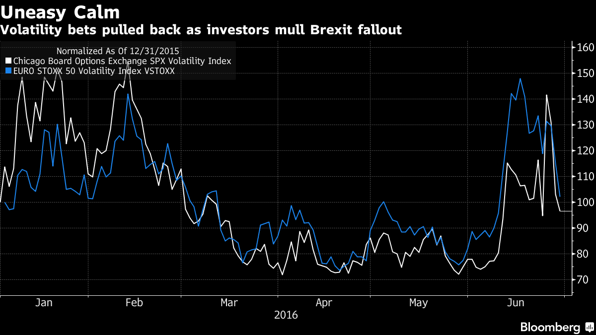 Всемирный индекс MSCI вырос на 2% по состоянию на 12:58 в Нью-Йорке, подтолкнув двухдневный рост до 3.7%. Индекс S&P 500 вырос на 1.4% после скачка на 1.8% в течение прошедшей сессии, что стало лучшей производительностью почти за четыре месяца. Индекс Stoxx Europe 600 подскочил на 3.1%. Индекс восстановил 4.7% после снижения на 11% в течение прошедших двух дней. Индекс доллара Bloomberg, отслеживающий позиции валюты против 10 основных валют, снизился на 0.4% следом за снижением в таком же размере в течение последней сессии и на фоне спекуляций в отношении пути повышения процентных ставок ФРС. Фунт рос второй день подряд против доллара, так как инвесторы ожидают британского плана по выходу страны из ЕС. Иена подросла на 0.1% следом за снижением на 0.7% во вторник. В Nomura Holdings Inc. прогнозируют, что валюта к концу года на 17% после решения оставить ЕС, спровоцировавшего спрос на безопасность.