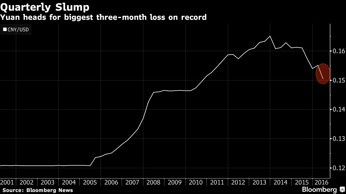 Худший по производительности квартал для юаня повышает риски оттока капитала. Китайская валюта снизилась на 2.9% с конца марта, что стало наибольшим снижением с 1994 года, торгуясь около минимума за пять лет. Снижение усугубилось после голосования в Британии, которое привело к скачку доллара и ударило по перспективам для китайского экспорта.