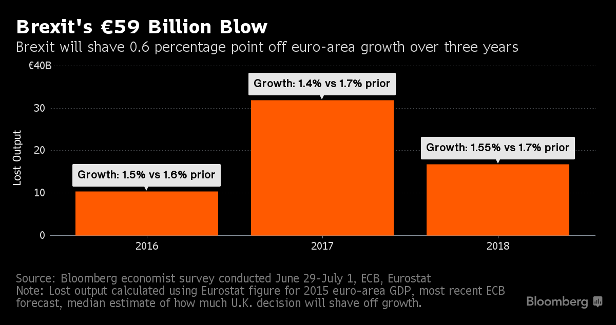 “Популизм - это настоящая угроза для сплоченности Европы в данный момент, а также спадроста, усложняющий решение многих проблем, - заявил Филипп Гудин, парижский ведущий экономист в Barclays Plc. - Чтобы выбраться из зацикленного процесса негатива, нам нужны очень сильные данные, в особенности высокий уровень доверия в деловых кругах в отношении будущего Европы”. Прогноз ЕЦБ на экономический рост в еврозоне составил 1.6% на 2016 год, и 1.7% на 2017 год, но с одной оговоркой: этот прогноз был сделан до решения Британии выйти из состава ЕС 23 июня. Следующее обновление прогноза запланировано на сентябрь. Экономисты в исследовании заявляют, что последствия Brexit вычтут 0.1% ВВП, в 2017 - 0.3%, и 0.15% в 2018 году. В денежном выражении это 59 млрд. евро ($66 млрд.) потерь. Пока же страны сильно разделены, и все они очень сильно сомневаются в способности соседа в необходимой степени реформировать свою экономику, потому пока что Европа движется в направлении глубочайшего кризиса.