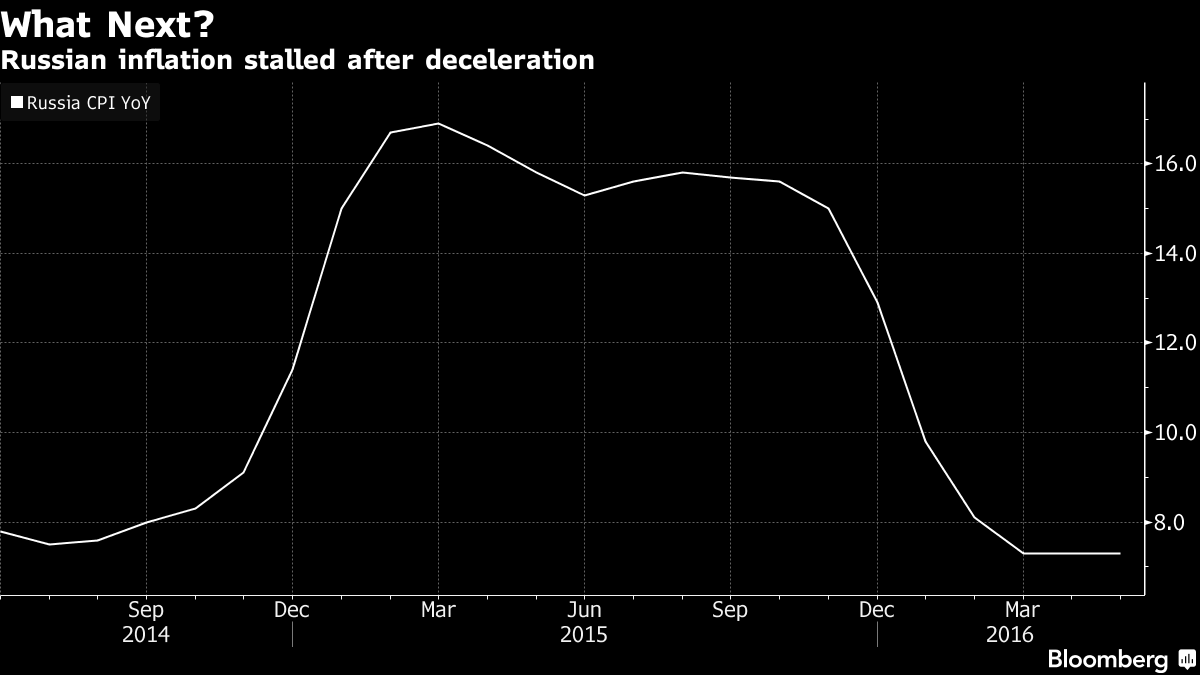 Это уменьшает количество препятствий для ЦБ на пути так называемого “умеренно-жесткого” курса политики фокусирования на 4% цели по инфляции к 2017 году. Хотя средняя оценка в исследовании Bloomberg указывает на то, что годовой темп роста цен достиг 7.4% в июне после нахождения на 7.3% в течение трех месяцев, по прогнозам центрального банка, этот показатель к концу года может составить 5%.