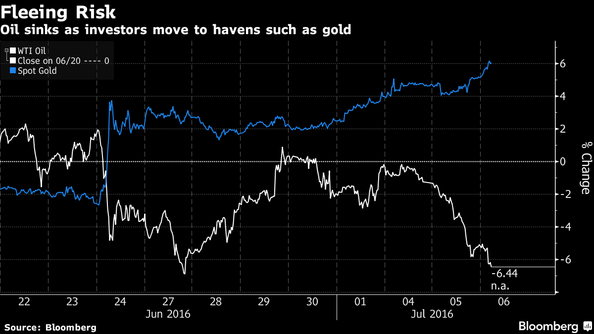 Нефть торговалась около минимума за неделю, так как инвесторы устремились к безопасным активам, включая золото и иену, не фоне возобновления опасений в том, что решение Британии покинуть ЕС ударит по глобальному росту. Цены упали на 4.9% во вторник. Золото выросло до двухлетнего максимума, иена выросла до максимального уровня в этом месяце после того, как председатель Банка Англии Марк Карни заявил о том, что риски в связи с Brexit начали получать физические очертания. Запасы нефти в США, вероятно, упали на 2.5 млн. баррелей на прошлой неделе, по данным исследования Bloomberg в четверг.
