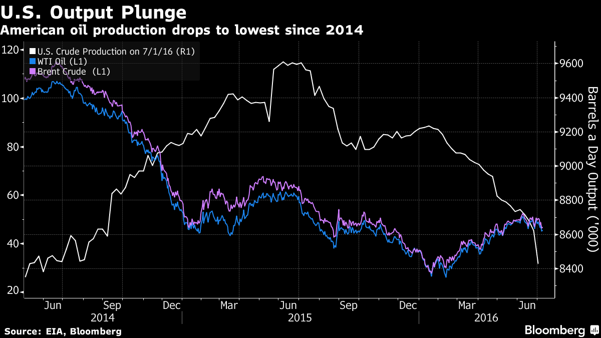 Добыча сырой нефти в США снизилась до 8.43 млн. баррелей в день за неделю по 1 июля, что стало минимальным уровнем с мая 2014 года. Количество активных буровых вышек в США росло в течение четырех из последних пяти недель, показали данные Baker Hughes Inc. Компании остановили более тысяч вышек с начала прошлого года. Запасы нефти в США падали седьмую неделю подряд до 524.4 млн. баррелей - минимума с 11 марта, по данным EIA.