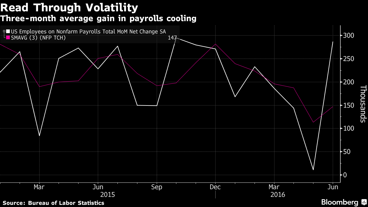 Данные могут успокоить рабочих и чиновников ФРС в том, что компании продолжат нанимать людей даже на фоне снижения прибыли и зарубежных событий вроде голосования Британии по выходу из состава ЕС. Даже на фоне неравномерного роста в июне занятость в течение последних трех месяцев в среднем составила 147K с почти 200K в первом квартале, что говорит о более умеренном тоне, т.к. экономика приближается к полной занятости.