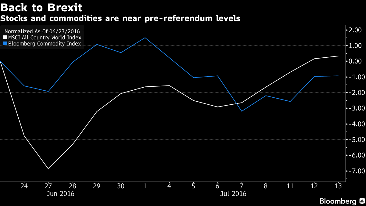 Глобальные рынки акций вернули почти все $4 трлн. стоимости, потерянные в течение нескольких дней после референдума в Британии следом за заялением политиков о готовности действовать, чтобы сдержать негативные последствия. Экономисты ожидают, что Банк Англии сократит процентные ставки уже в четверг, тогда как японский премьер-министр Синдзо Абэ заявляет о выработке новых мер фискального стимулирования. Президент ФРС Сент-Луиса Джеймс Буллард заявил во вторник о том, что он не ожидает почти никакого влияния Brexit на США, тогда как здесь трейдеры дают менее 50% вероятности повышения процентных ставок в этом году. Индекс Stoxx Europe 600 вырос на 0.2% по состоянию на 8:33 в Лондоне после роста на 5.5% в течение четырех дней. Индекс Азиатско-Тихоокеанского региона MSCI вырос на 0.7%, находясь в 1% от максимального уровня в этом году. Фунт вырос на 0.2% в рамках наиболее длинной череды роста с мая.