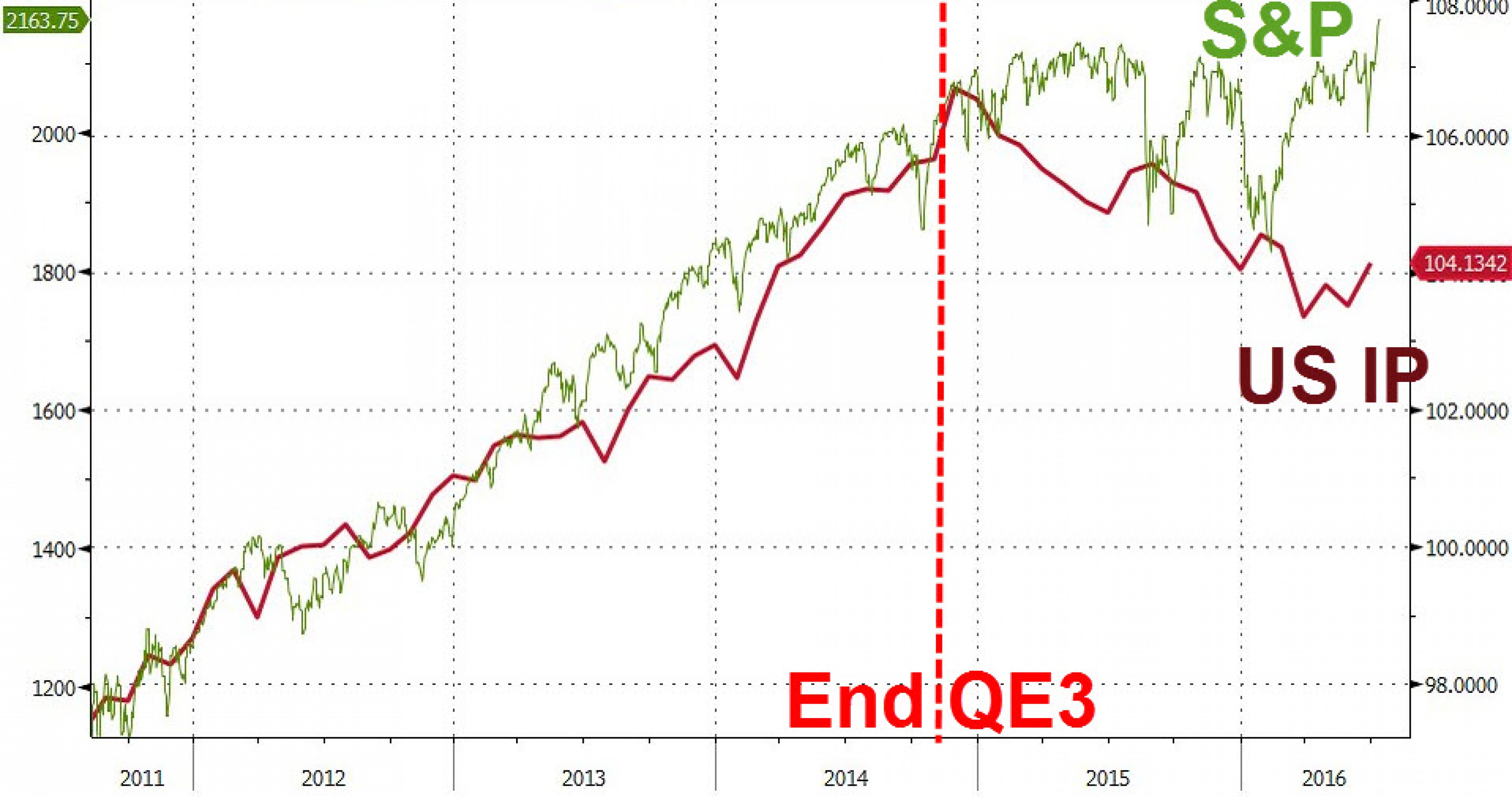 Кстати, здесь корреляция с фондовым индексом также нарушена: сразу по окончании программы QE3 показатель "промышленное производство" начал снижаться.