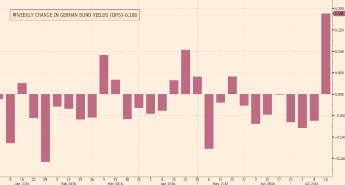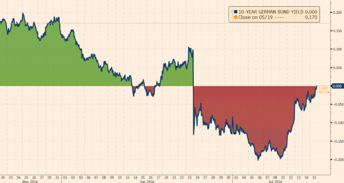 Результаты референдума и последующие рыночные волнения вызвали прогнозы на дальнейшее смягчение политики со стороны центральных банков, что вылилось в снижение доходности эталонных гособлигаций до рекордных минимумов от Британии до Австралии. Доходность облигаций коснулась рекордного минимума на уровне -0.179% 6 июля. С тех пор рынки успокоились, а спрос на риски восстанавливался, толкая инвесторов в сторону от безопасных облигаций с отрицательной доходностью в пользу акций и более высокодоходных облигаций.