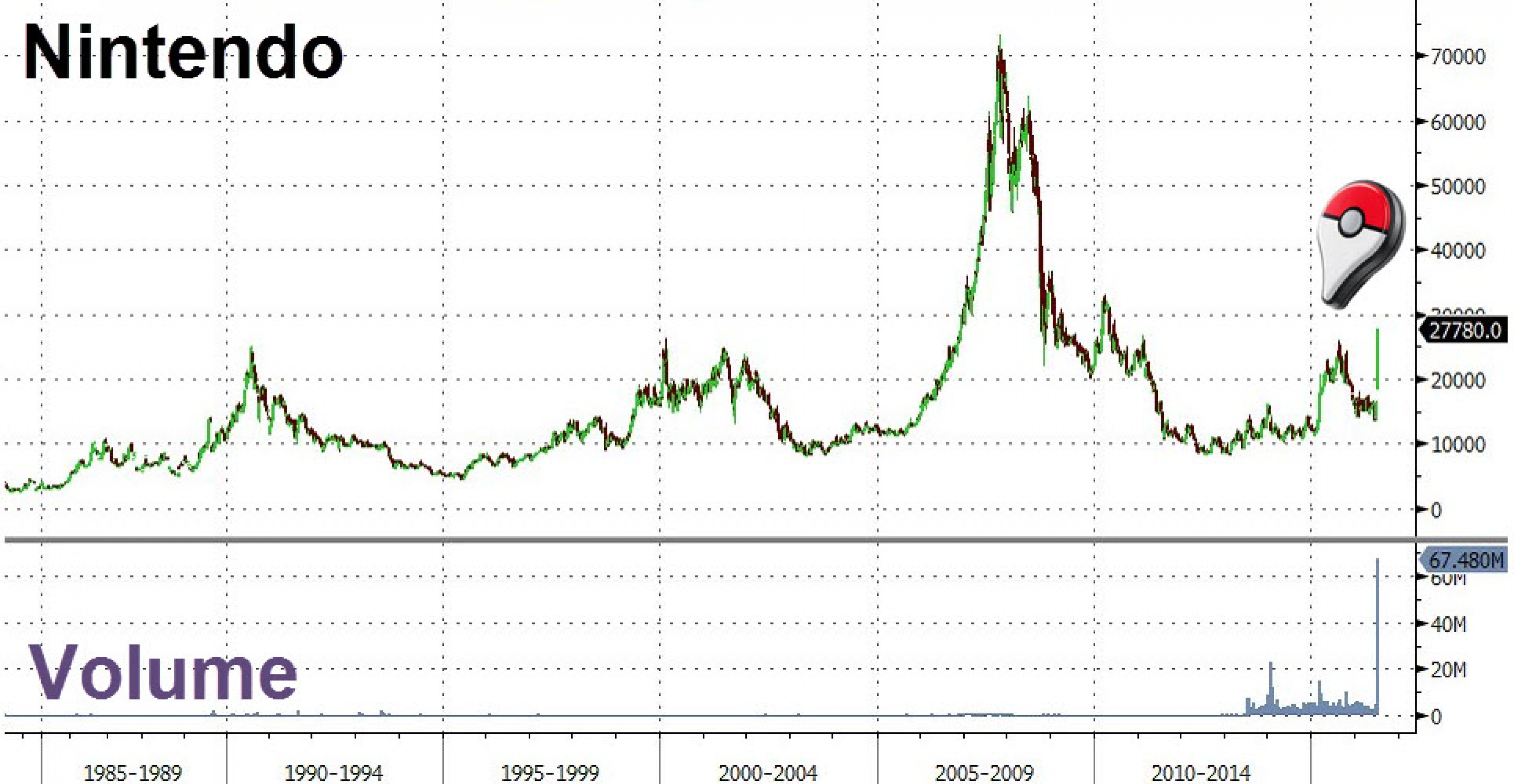 Мир охватила Pokemania, все только и говорят о новой игре. Разумеется, трейдеры и инвесторы сразу начали закладывать потенциальную прибыль одного из владельцев - компании Nintendo - в ее акции. Капитализация достигла максимума за 6 лет, а объемы торгов акциями компании и вовсе установили абсолютный рекорд за всю историю торгов японского фондового рынка.