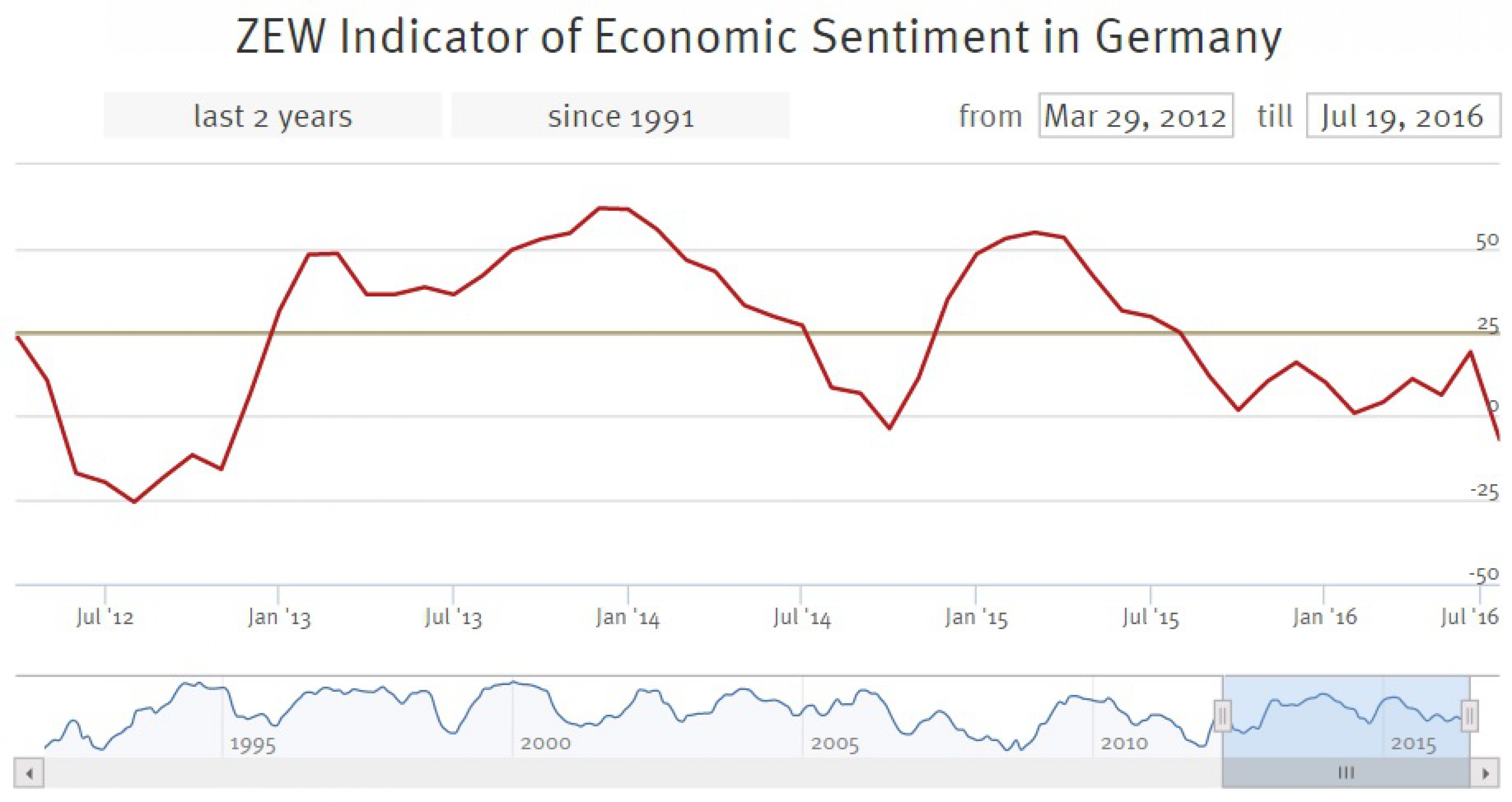 По данным пресс-релиза Центра европейских экономических исследований (Zentrum für Europäische Wirtschaftsforschung, ZEW), индекс настроений инвесторов и аналитиков по экономике Германии обвалился с отметки 19,2 пункта в июне до уровня в -6,8 пунктов в июле 2016 г., впервые с октября 2014 г. опустившись до отрицательных значений. Текущий уровень является минимальным с ноября 2012 г.