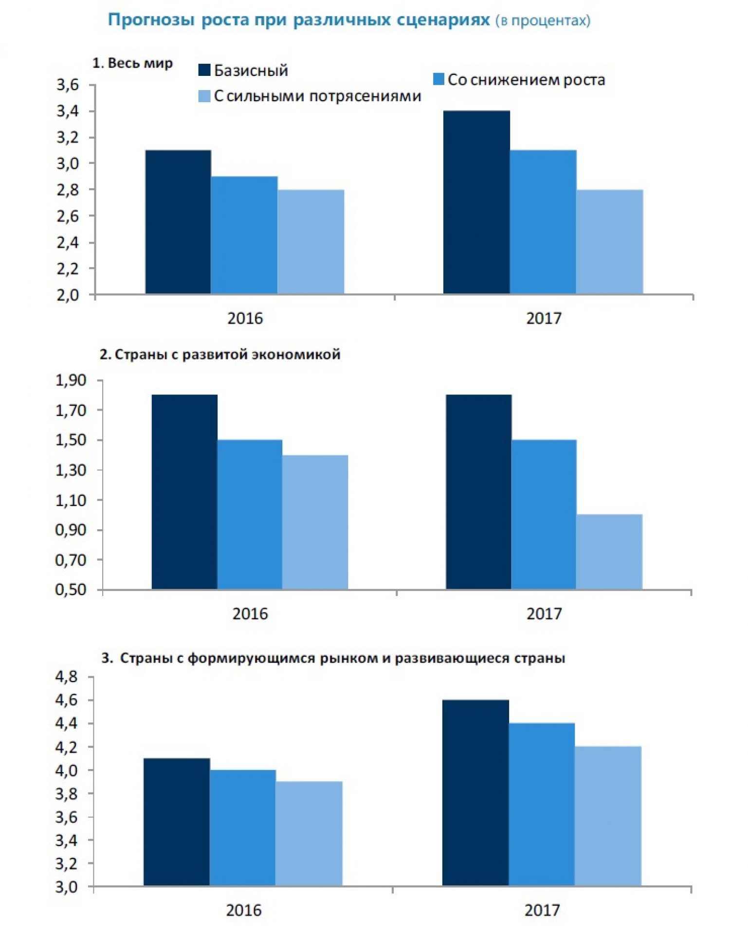 По сравнению с базисным прогнозом в этом докладе в настоящей вставке приводятся два альтернативных сценария для мировой экономики, названных "сценарием со снижением роста" и "сценарием с сильными потрясениями".